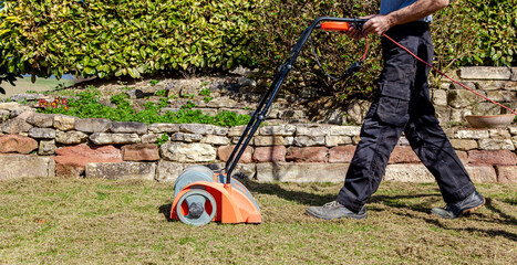 Beginnen Sie mit dem Vertikutieren: Beginnen Sie am Rand des Rasens und arbeiten Sie sich dann langsam in Richtung der Mitte vor. Achten Sie darauf, dass Sie sich gleichmäßig bewegen und keine Stellen auslassen.